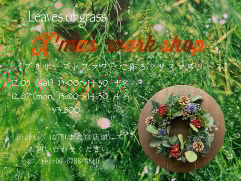 毎年楽しみにしてくださっている方々も多い、X'masワークショップのお知らせです。